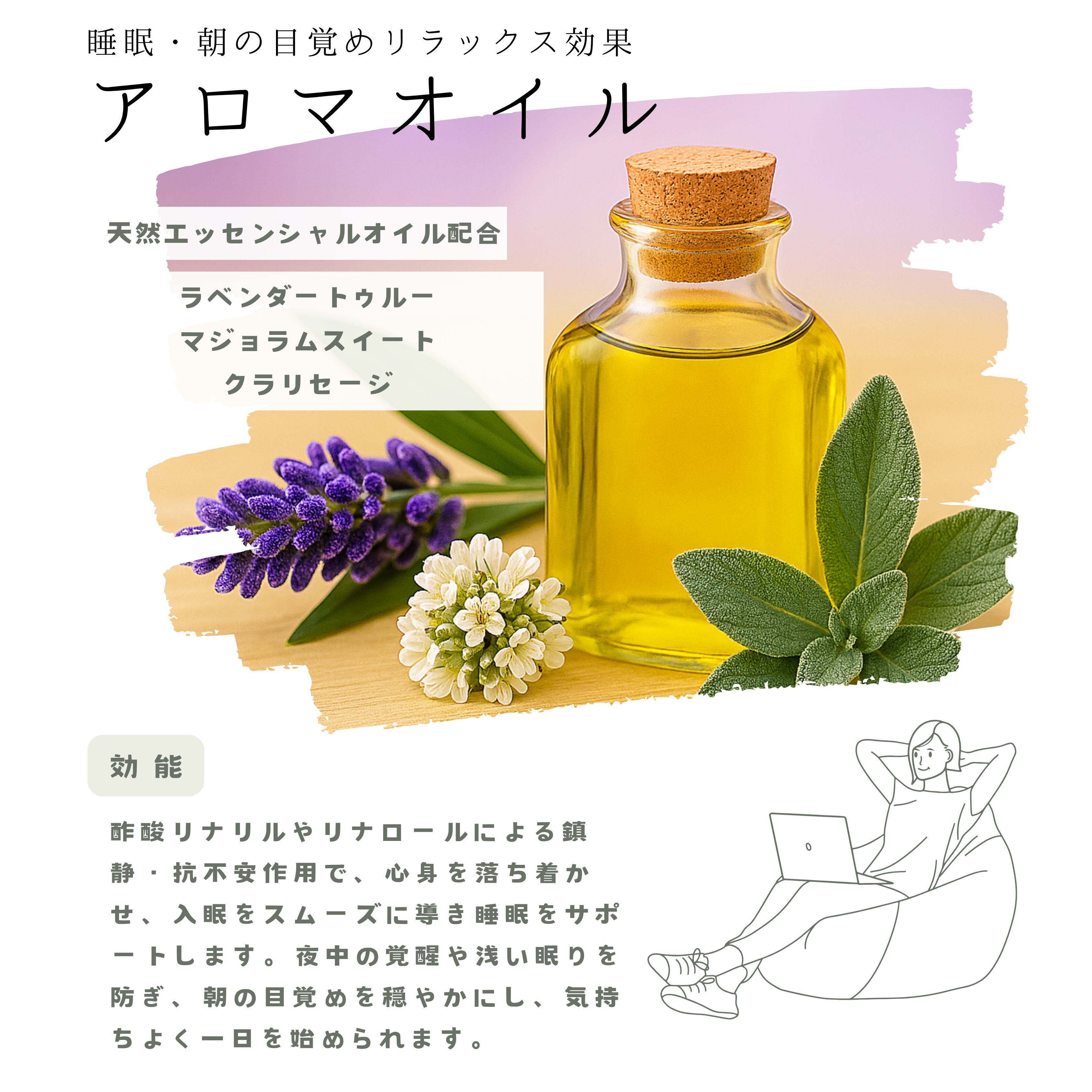 酢酸リナリルやリナロールによる鎮静・抗不安作用で、心身を落ち着かせ、入眠をスムーズに導き睡眠をサポートします。夜中の覚醒や浅い眠りを防ぎ、朝の目覚めを穏やかにし、気持ちよく一日を始められます。