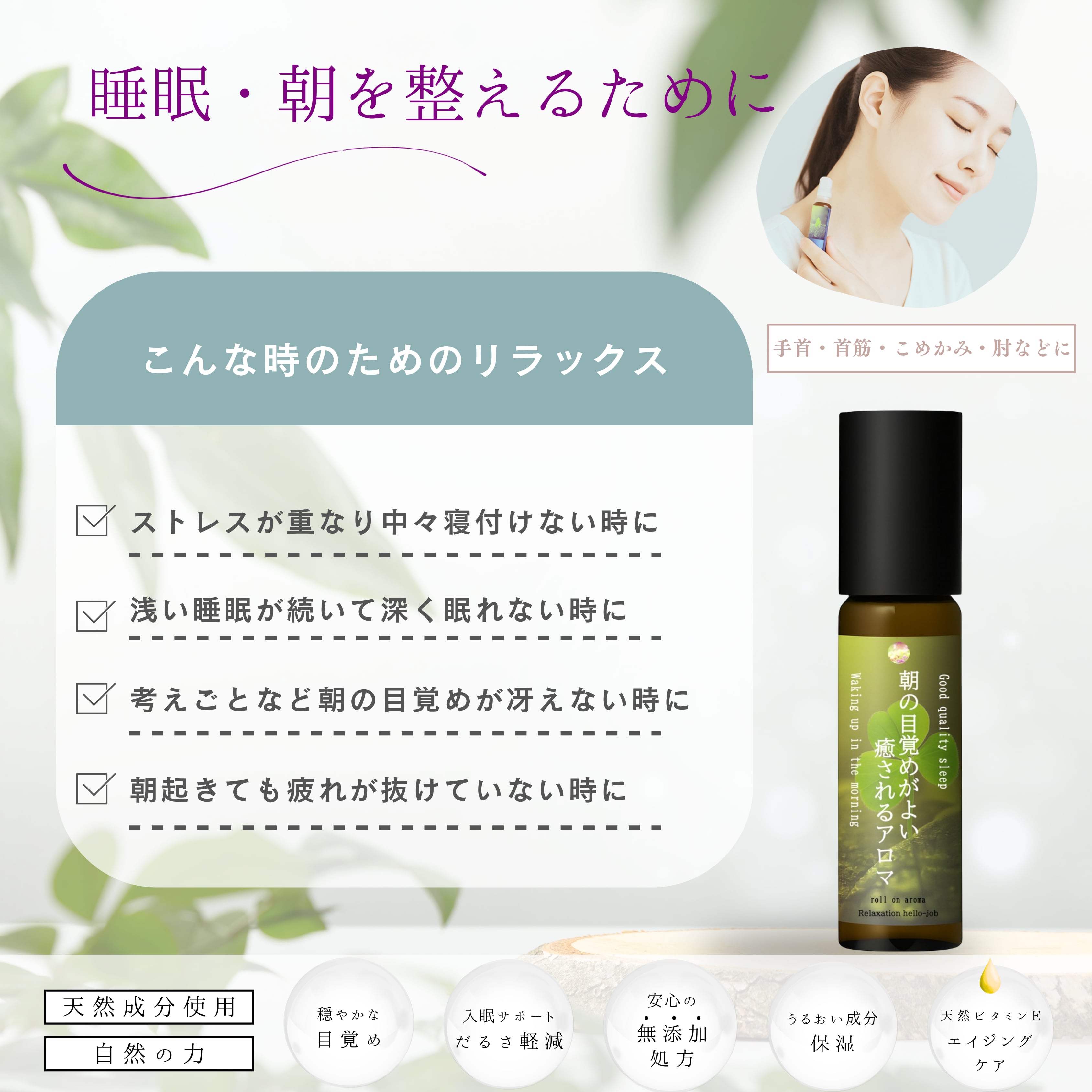使用方法:手首、首筋、こめかみ、肘などにロールを転がしながら塗布します。