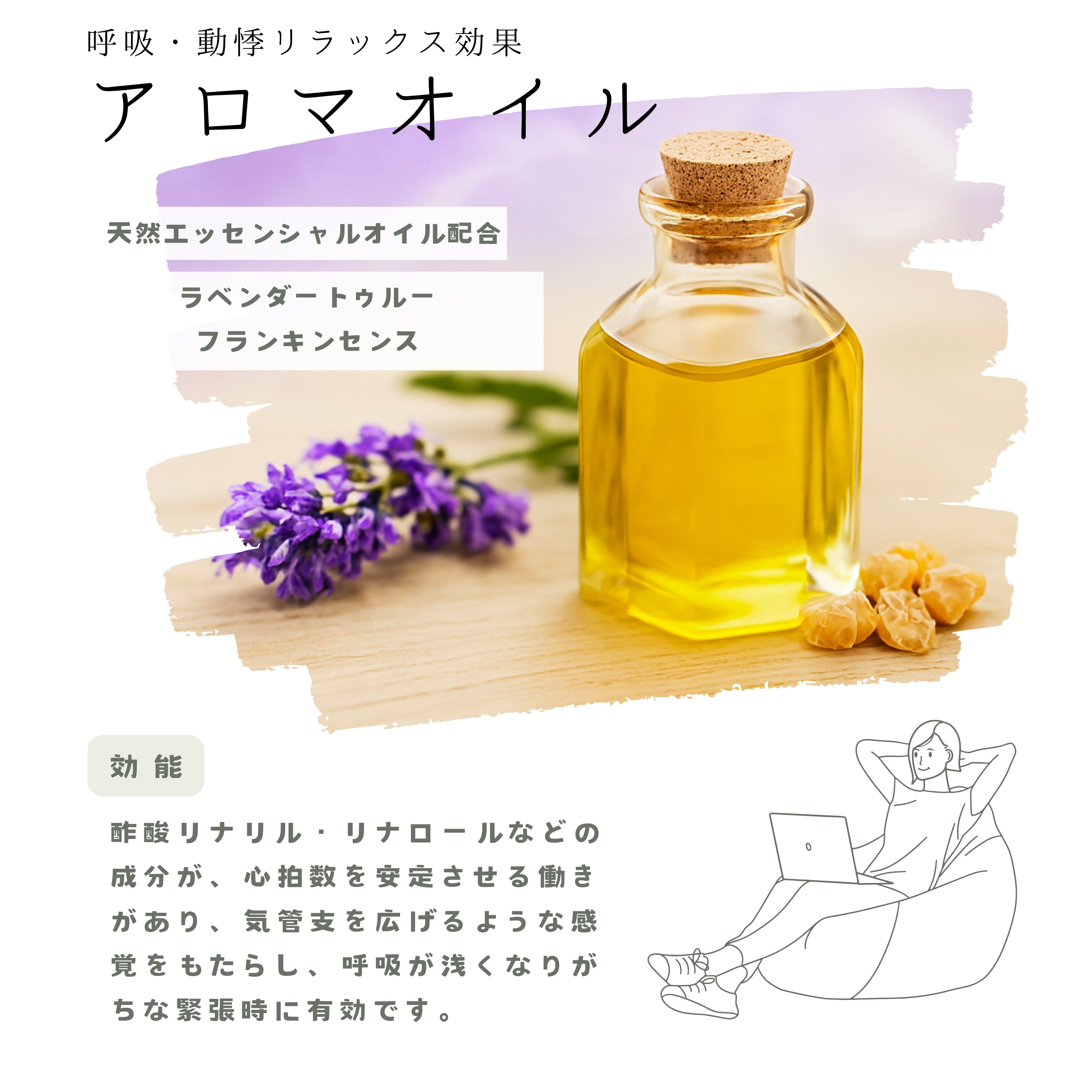 酢酸リナリル・リナロールなどの成分が、心拍数を安定させる働きがあり、気管支を広げるような感覚をもたらし、呼吸が浅くなりがちな緊張時に有効です。